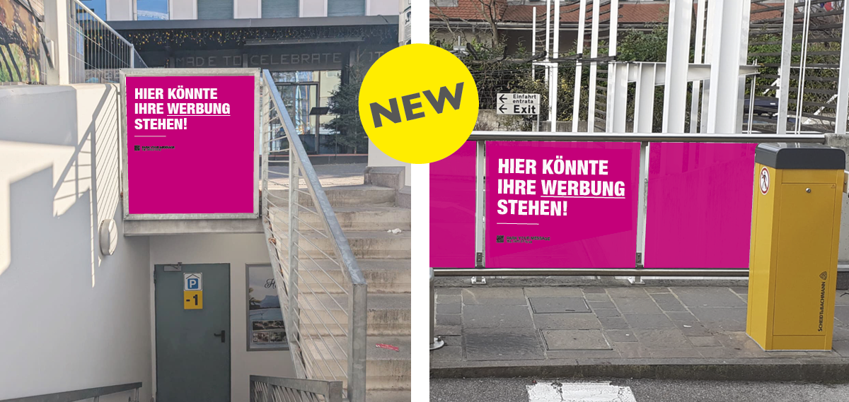 Aktuell verfügbar: Werbeflächen in verschiedenen Größen, auf Wunsch mit praktischem Flyer-Dispenser.